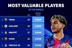体育资讯03月30日讯 在更新多个联赛身价后,德转盘点当前足坛身价TOP50。亚马尔、哈兰德、姆巴佩2亿欧领衔,20人身价过亿,意甲仅劳塔罗和伊尔迪兹进入前50。