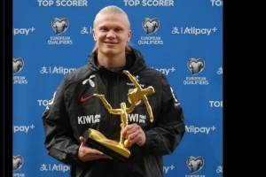 哈兰德本届欧洲世预赛打进16球,荣膺最佳射手,他在社交媒体上晒出手拿奖杯的照片,庆祝自己获得这一奖项。