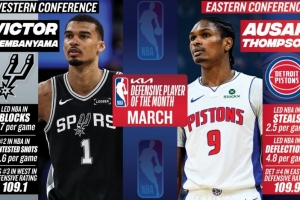 在3月份,文班亚马场均3.7次盖帽排面联盟第二,场均11.6次干扰投篮排名联盟第二,马刺以109.1的防守效率排名西部第三;奥萨尔·汤普森场均2.5个抢断、4.8次干扰传球领衔联盟,活塞以109.9的防守效率排名东部第四。