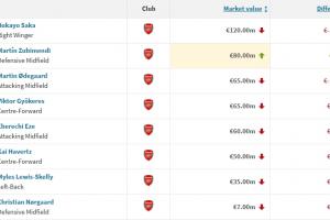 英超榜首阿森纳多人身价被砍!萨卡、厄德高跌1000万,仅1人上涨