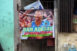 霍华德社媒晒出的照片中,菲律宾球迷庆祝阿德巴约拿到83分,但是用的是霍华德的照片。霍华德还晒出了一张两人照片对比。